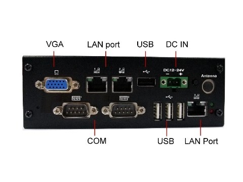 I/O 1 x Digita I/O tilslutning via 6 pin terminalblok. Tænd/sluk knap, 1 x Power LED, 1 x HDD LED 1 x PCIe Mini-card interface til trådløs eller GPRS modul