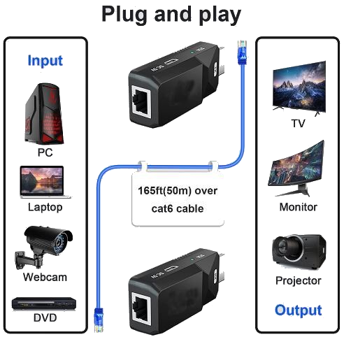 Long range transmission: up to 50m/165ft over a single CAT6 cable;