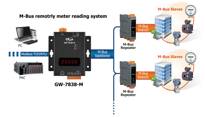 M-Bus (Meter-Bus) is a communication interface that is widely used in different meters, eg. Electric meters, water meters, heat meters, etc. Easy installation (two-wire system includes power and communication function) and robustness are the most important features. M-Bus has its own physical layer and protocol. Therefore, it is usually changed to other systems, e.g. Modbus, to facilitate overall use.