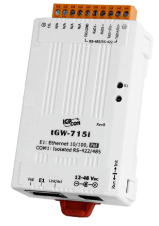MODBUS/TCP to serial RTU Master/Slave, Gateway, 1 x 1 x RJ45 RS485 / 422 isolated, -25 - +75°C, PoE, or 12 - 48VDC