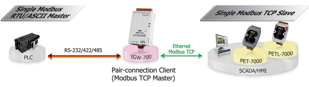 ETH-MODGW7xx series is a Modbus gateway that allows for a Modbus TCP / IP - UDP host to communicate with serial Modbus RTU / ASCII remote terminal units through an Ethernet network, thus eliminating the cable length limitation of legacy serial communication devices . The module can be used to create a pair-connection application (Pair-connection) as well as serial-bridge or serial-tunnel application) and can then route data over TCP / IP between two serial Modbus RTU / ASCII devices, is useful when connecting mainframe computers, servers or other serial devices using Modbus RTU / ASCII protocols and does not even have Ethernet capability. The maximum number of TCP connections for each serial port is up to 32 (RevB), this offers several Master access to slave devices on the same serial port. Read cache function is used to save previous requests and responses in the memory buffer in ETH-MODGW7xx. When other HMI / SCADA master controller sends the same requests to the same RTU slave device returns the cached answer immediately. This feature dramatically reduces the load on the serial