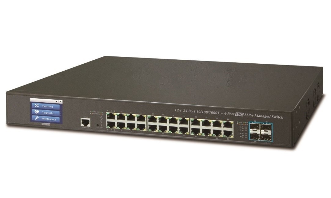 24 port managed switch 24 x 10/100/1000Mbit RJ45. Fiber 4 x 10Gbit / 1Gbit SFP slot, LCD touch screen, 230VAC