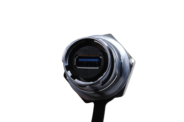 Waterproof USB3.0 chassis female connector, IP67 with cap, 1 meter cable with USB A male. Bayonet for cable connector. Plastic.