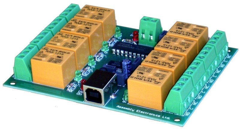 8 x relay com, NO, NC. 24VDC, 250VAC 10A via USB, HID