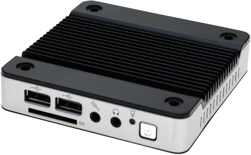 A very small embedded PC. The cabinet has 4 through mounting holes for mounting on a VESA75 bracket (or surface). The PC has a very low power consumption (10 W) and uses a standard SD card as storage instead of a hard disk. This makes it completely silent as it also does not contain any fans. NB: Delivered without SD card and software.