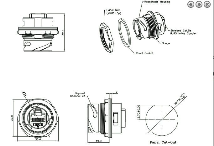 RJ45 socket: phosphor bronze, finish: gold over nickel connector can be front-mounted to a maximum panel thickness of 3.2 mm.