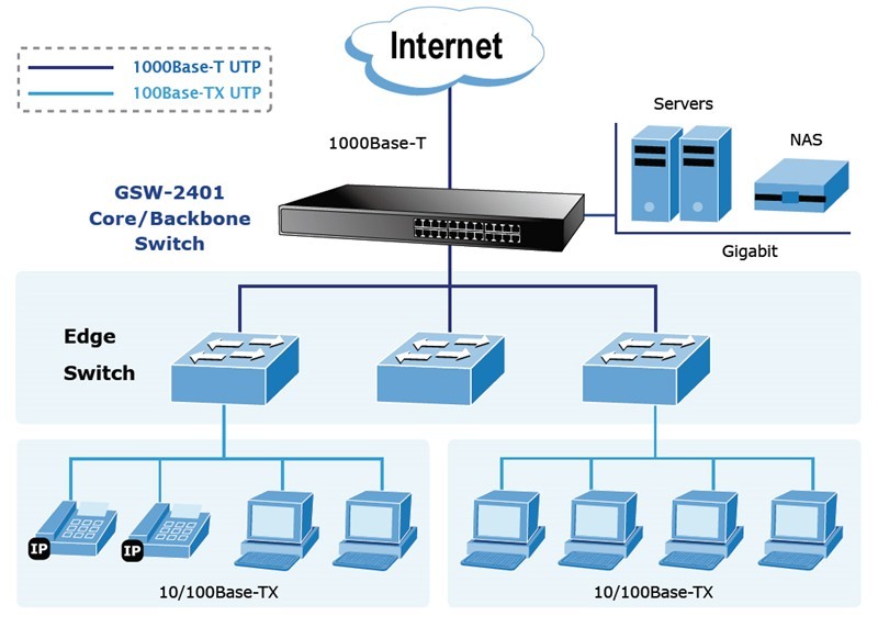 Ethernet switchen understøtter forbindelser fra 10 Mbit/s til 1000 Mbit/s og har stor intern båndbredde så alle porte kan arbejde med fuld hastighed samtidig. Det gør den bl.a. velegnet som fordelings-switch (backbone switch) når alle pc’erne i netværket skal på gigabit net. Switchen har auto crossover funktionalitet, der sikrer mod forkert anvendte patchkabler, idet switchen tilpasser sig et krydset eller ikke-krydset kabel automatisk.