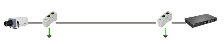 RJ45 overspenningsvern, PoE 10/100/1000Mbit. 0,2dB tap. 2,5kA, DIN-montering.