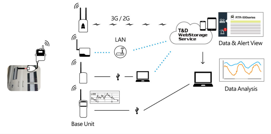 LOG WL505MA serien kan du mikse og matche en rekke trådløse radiokommunikasjons loggere med forskjellige grunnenheter eller data samlere til å møte dine behov. Loggede data kan sendes automatisk via nettverket eller mobil kommunikasjon som skal lagres i den sky lagring eller til et bestemt sted.