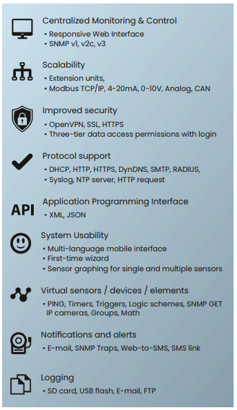 Kan overvåke opptil 100 fysiske sensorer. Kan bruke opptil 700 forskjellige elementer - meldinger, triggere, tidtakere, logikkskjemaer, sensorer og tørre kontakter.