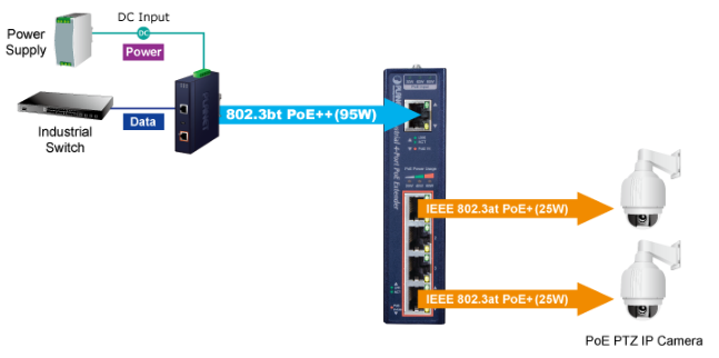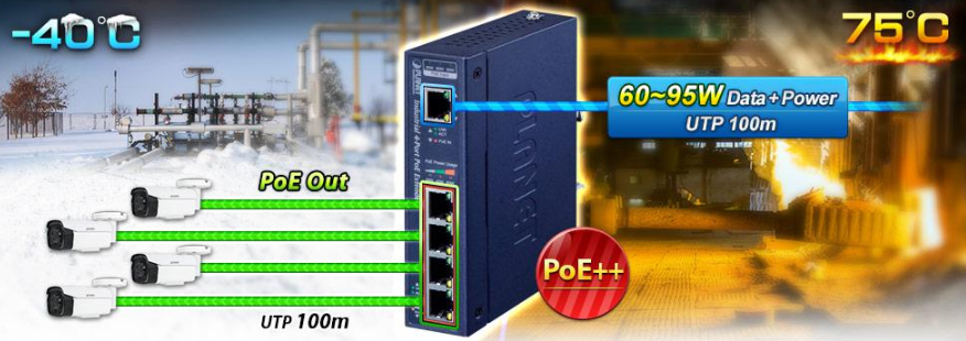 Det er en industriell 1-Port 802.3bt PoE++ til 4-Port 802.3af/at Gigabit PoE Extender designet spesielt for punkt til flerpunkts PoE-applikasjon. Man kan oppnå maksimalt 95 watt PoE-effekt fra 802.3bt PoE++-inngangsport og leverer et maksimalt 75-watts PoE-strømbudsjett til 4 PoE-utganger, noe som utvider både rekkevidden av Gigabit Ethernet-data og IEEE 802.3at Power over Ethernet utover standard 100 m (328 fot) Kat. 5/5e/6 UTP-kabel for 200m hvor opptil 4 strømdrevne enheter (PD-er) kan strømforsynes samtidig. Det er en enkel løsning for å legge til PoE-porter uten å kjøre flere kabler og oppnår mer fleksible nettverksapplikasjoner uten å kreve en ekstern strømadapter.