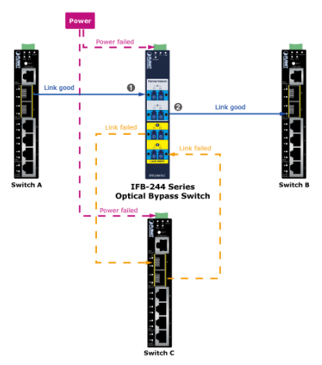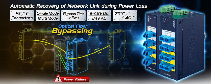 For å beskytte det kritiske fiberoptiske nettverket mot svikt i strømsystemet, er FIBER-BYPASS-XX-serien en ultrarask automatisk gjenopprettingsløsning for fibernettverk som ikke tåler avbrudd dersom det er strømbrudd på noen kritiske nettverkssvitsjer. Redundant ryggradsdesign med FIBER-BYPASS-XX som bypass (fiberbytte) kan minimere dette.