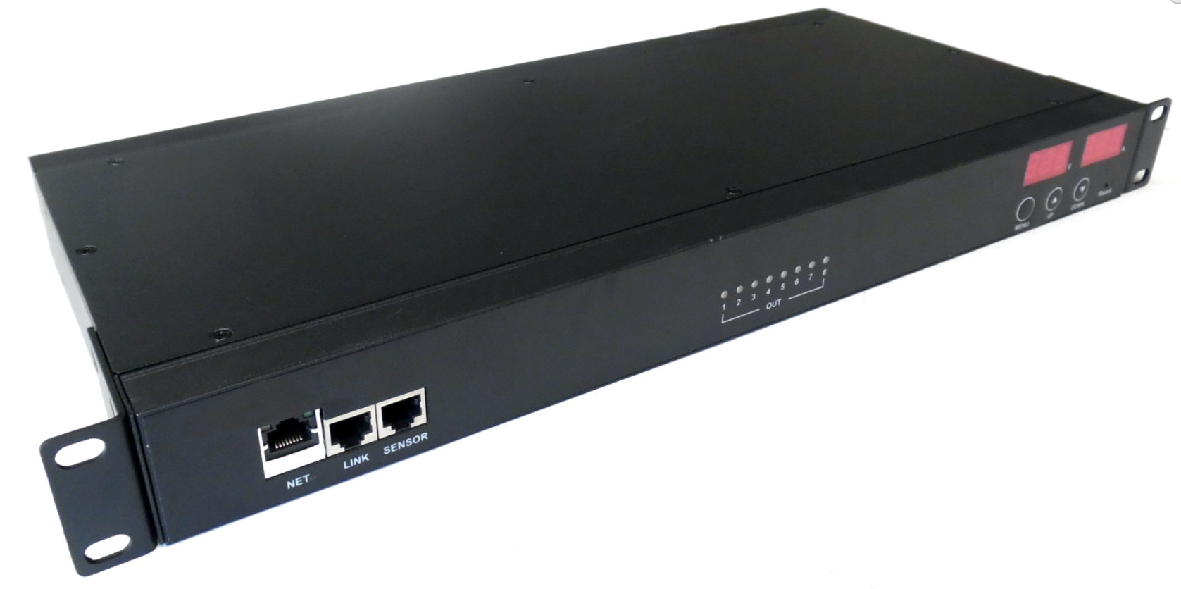 8-kanals PDU med 8 x IEC C13 låsbare utganger. 1 x IEC C20 16A inngang. PÅ/AV, OVERVÅKNING, EXT. SENSORINNGANG, RJ45