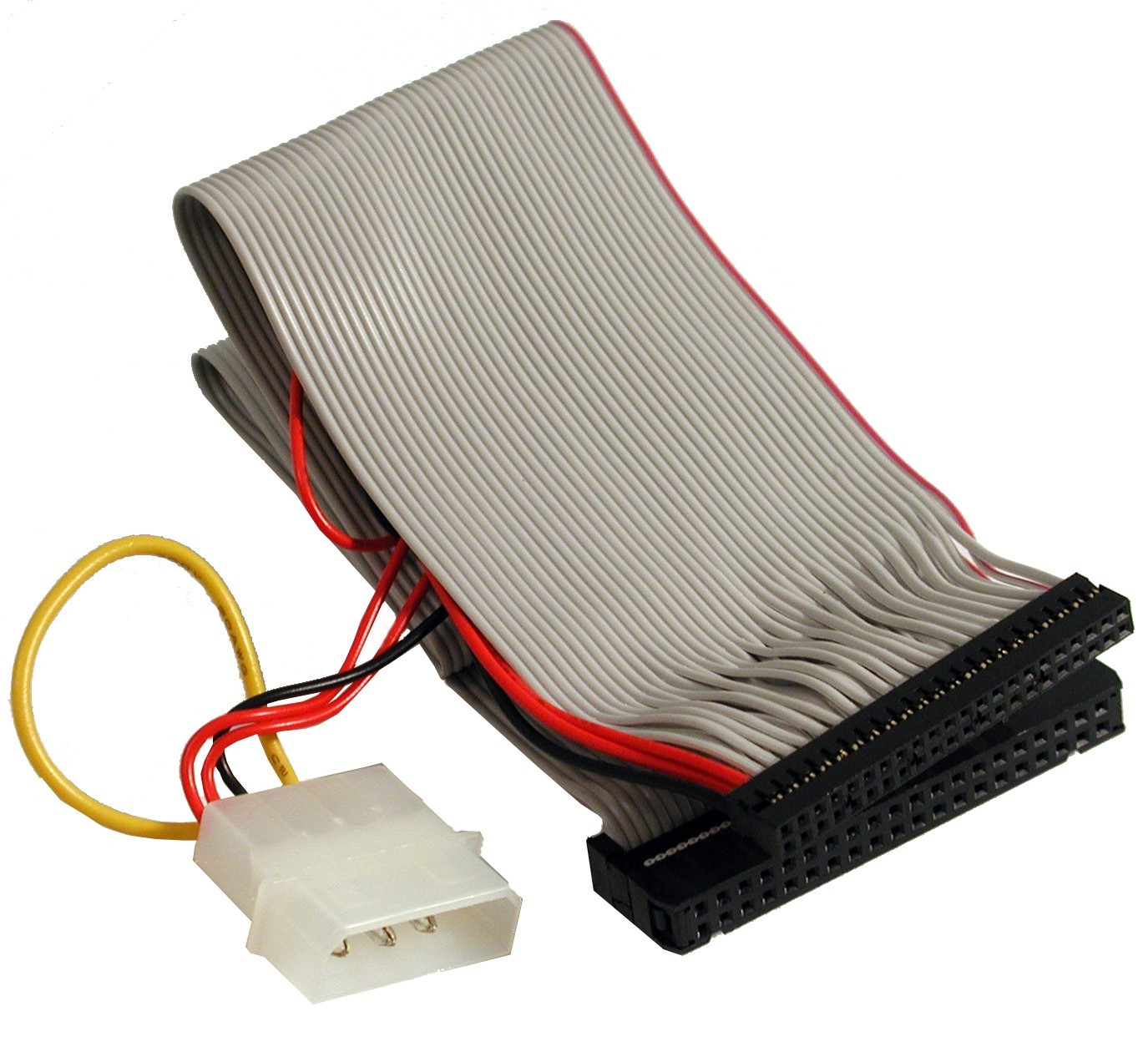 Konverterkabel mellom 44-pinners 2½-kontakt og 40-pinners 3½-kontakt, flatkabel. Molex for 5VDC for 2½ HDD