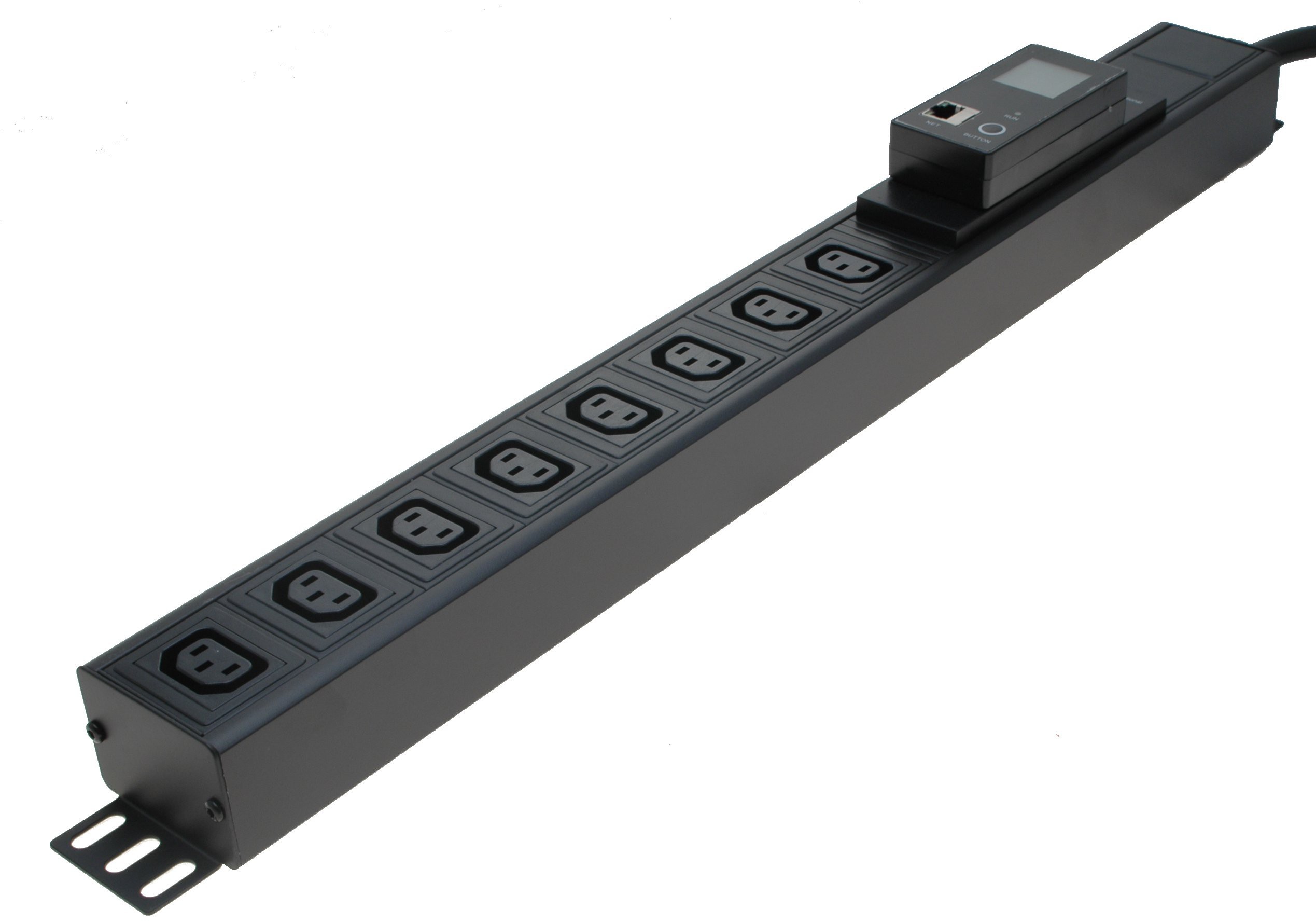Forgreningsskinne med nettverk og strømmåler. Med 8 x C13-uttak