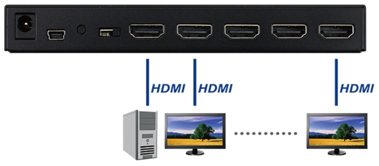 4 porter HDMI 4K @ 60Hz splitter, 1 x HDMI inn, 4 x HDMI ut, 5VDC
