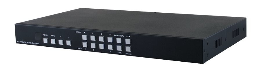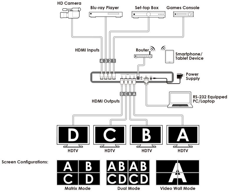 - Matrix-modus: Kan rute og sende ut 4 kilder til alle 4 skjermer med sømløs bryting (Merk: Under utgangstiden 1080i @ 50/60 inngang 4 vil bli deaktivert, OSD vil vise "IN 4 Disabled")