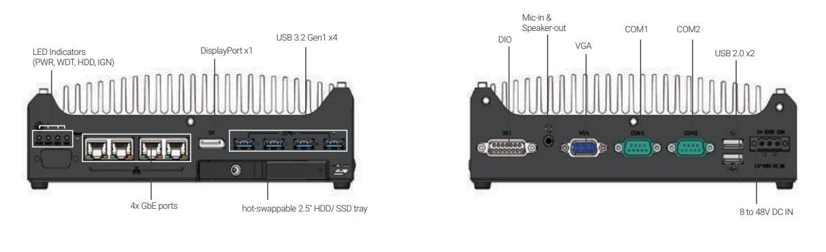 Den har omfattende I/O-funksjoner. Den har fire GbE- og fire USB 3.2 Gen 1-porter for tilkobling av flere kameraer. I tillegg har den et Gen4 x4 M.2 NVMe-spor for de nyeste NVMe SSD-ene, som støtter lese-/skrivehastigheter på opptil 7000 MB/s. Den har også en andre hot-swap-harddiskskuff for å hot-swap-e lagringsstasjonen uten å slå av systemet eller fjerne kabinettet. Det er to mPCIe- og ett M.2-nøkkelspor for å installere WiFi eller 5G/4G for trådløse kommunikasjonsbehov. I tillegg er den også utstyrt med 8x DIO-, 2x COM-porter og doble skjermutganger for dine applikasjonsbehov.