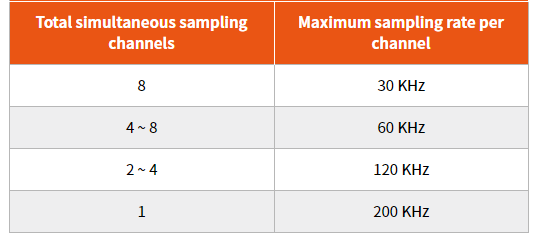 200kS / s (200 kHz) for hver kanal samplingsfrekvens