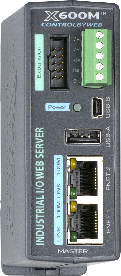X-600M-I fungerer som en kraftig hovedkontroller for andre ControlByWeb™-moduler. Med den spesielle sammenkoblingsflatkabelen er det mulig å koble opptil 64 utvidelsesmoduler direkte til X-600M-I. Den kan også kontrollere hvilken som helst av våre andre frittstående ControlByWeb-enheter over et Ethernet-nettverk med opptil 128 enheter.