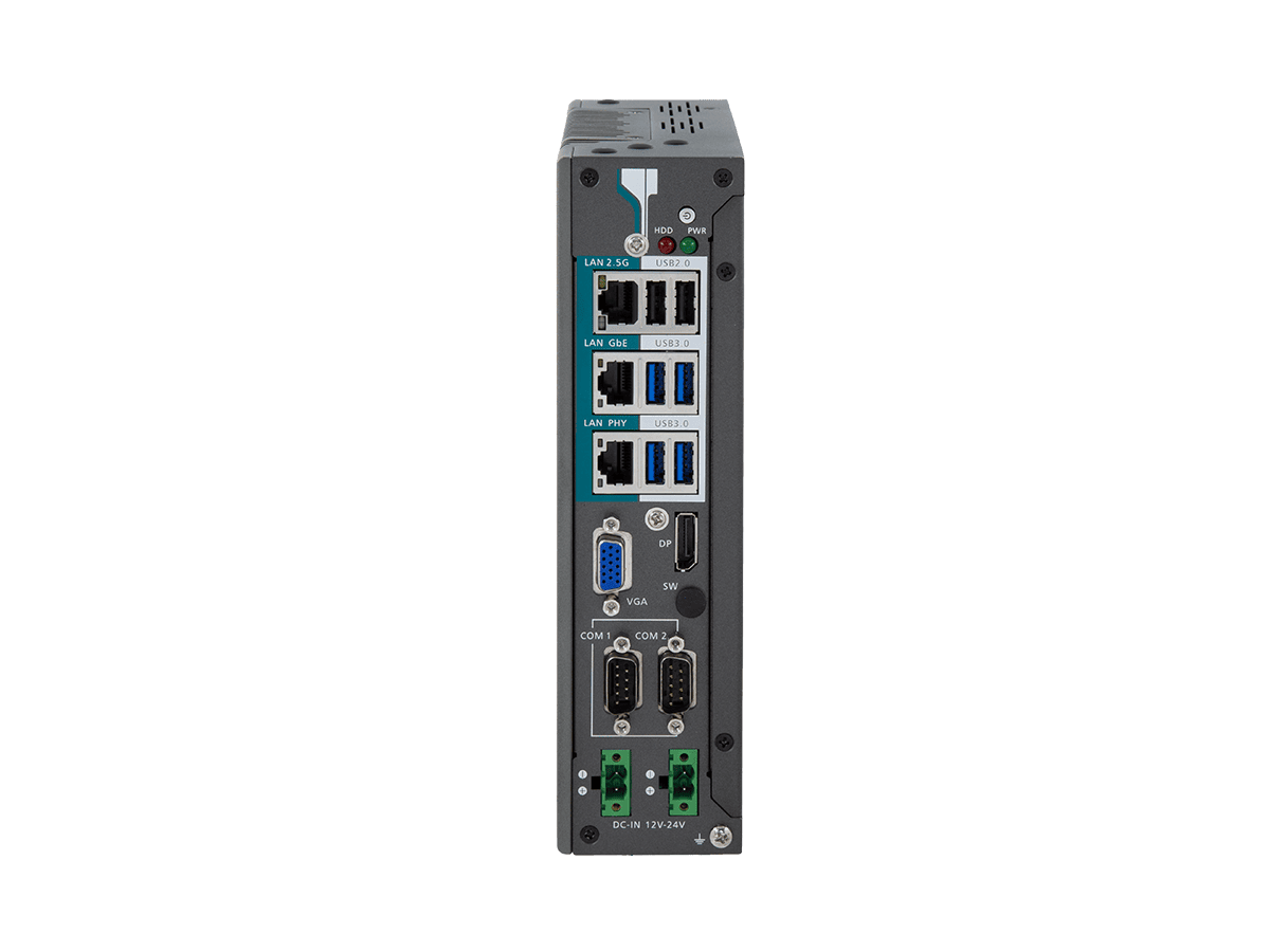 Vifteløs støtte for Intel® 14./13./12. generasjons Core™ 35W CPU, 2xCOM 8xUSB, 2xLAN, HDMI, DP, DIN-montering, DC 12~24V