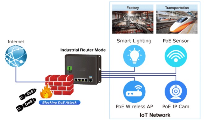 ETH-RUTER 4POE + U kan fungere som en alt-i-ett-ruter i en industriell anvendelse for et selskap som har en fabrikk og mange forskjellige avdelinger. ETH-RUTER-4POE + U kan gi opp til 4 PoE +, in-line kraft grensesnitt, sentralisert styring av strømtilførselen til fabrikken, hvor POE IP-kameraer og PoE sensorer er innebygd. Det gir også data tilkobling for Office-dokumenter. På samme tid, for å ETH-ROUTER 4POE + separate brukere og IOT enheter med VLAN har god ytelse. Med Brannmurbeskyttelsens hindrer IOT nettverk trusler, noe som gjør industriell nettverk sikrere