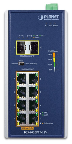 ESW8G-UP-SFP2 med åtte Gigabit Ethernet 802.3at PoE+ in-line strømgrensesnitt, egnet for bygninger der sikkerheten er strengt håndhevet, kan enkelt bygge en strøm sentralt administrert for et IP-telefonsystem, IP-overvåkingssystem og trådløs AP-gruppe i tøffe industrielle miljø. For eksempel kan 8 PoE IP-kameraer eller PoE trådløse AP-er enkelt installeres for overvåkingskrav eller et trådløst roamingmiljø kan bygges i industriområdet. Uten begrensning av strømplugger, gjør ESW8G-UP-SFP2 installasjonen av IP-kameraer eller trådløse AP-er enklere og mer effektiv.