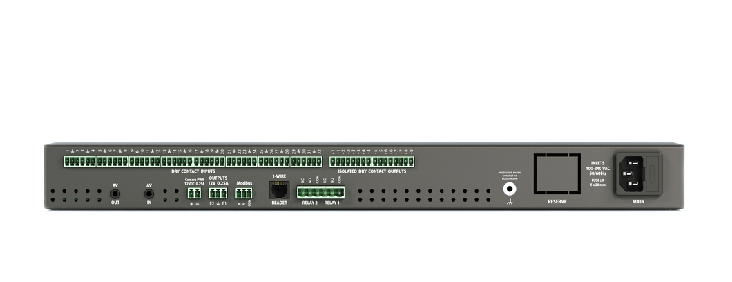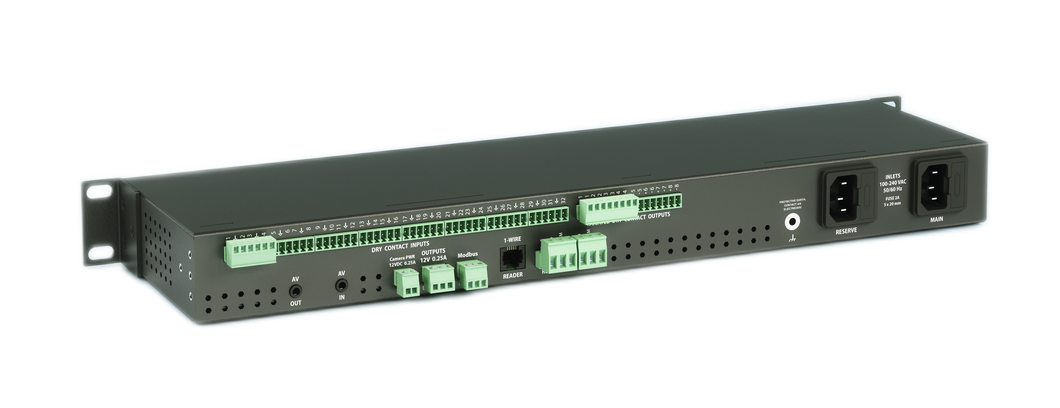Slå på og av utstyr via nettverk, 8 x Schuko-utganger, opptil 10A, RJ45, RS232, 2 innganger for temperatur- / fuktighetssensor