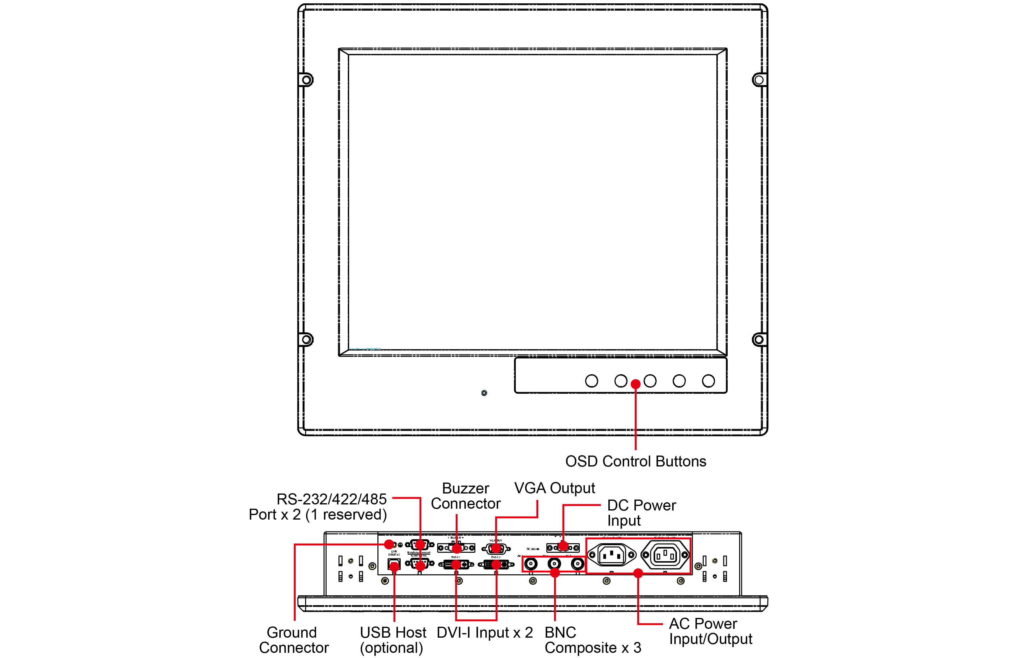 19 "TFT-skjerm med 350 nits LCD, med strøm uten berøring, støv og lekkasjetett IP66, Dual AC / DC-innganger,
