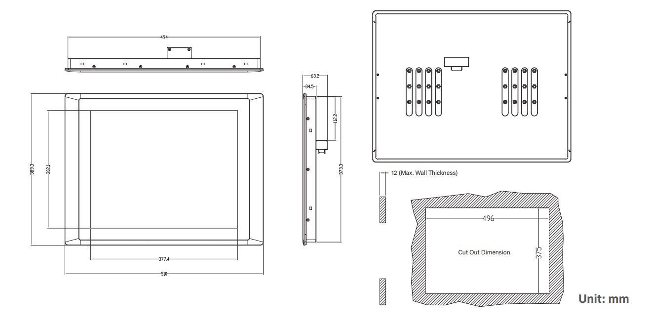 19" Monitor sollyslesbar TFT-LCD, projisert kapasitiv berøring (PCAP), IP65 front, VGA, DVI-D, DisplayPort, 9~48VDC