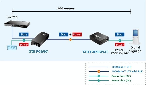 ETH-POE50SPLIT er en PoE splitter, der kan dele PoE-signalet til netværkstrafik og spænding. Dermed kan enheder der ikke understøtter PoE-standarden forsynes gennem netværkskablet.