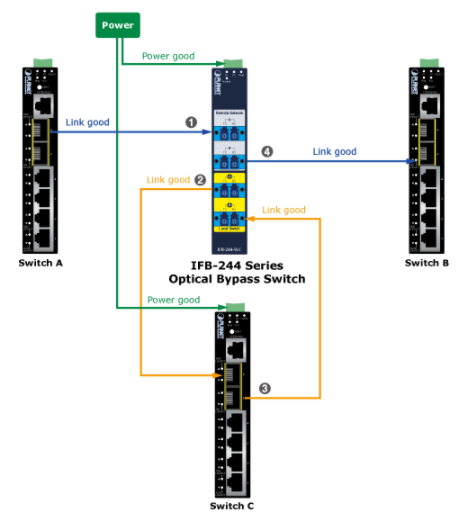 Ved et strømbrudd inntreffer, arbeider fFIBER-BYPASS-XX serie i en omkoblingstilstand innen 8 millisekunder, som direkte videresender pakke Ethernet mellom to ytre fiberomskiftere og omgår den lokale fiberomskifter.