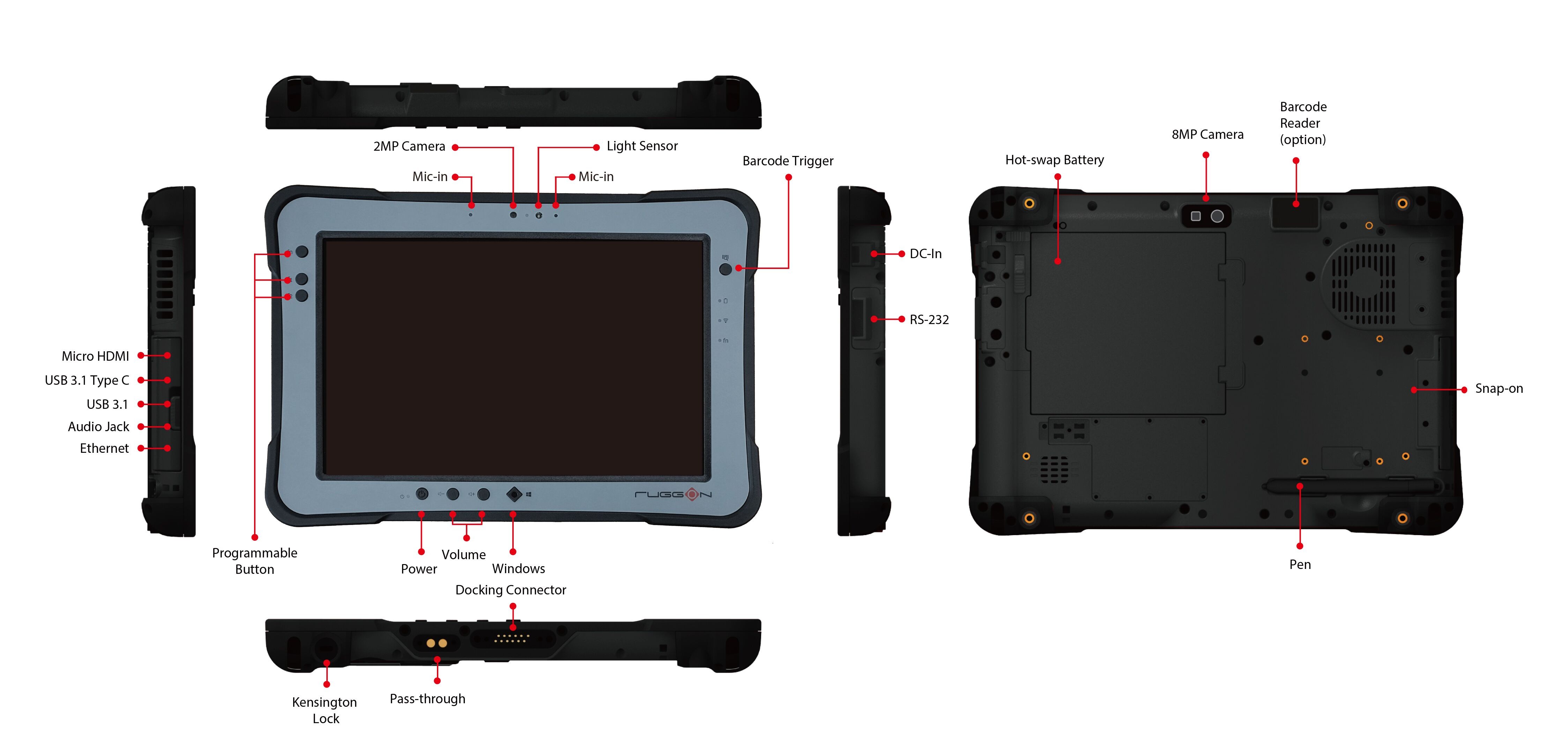I/O 1 x RS-232, 1 x USB-A 3.1, 1 x USB-C 3.1 1 x Micro SIM slot, 1 x Micro HDMI, 1 x docking connector 1 x RJ 45 gigabit ethernet