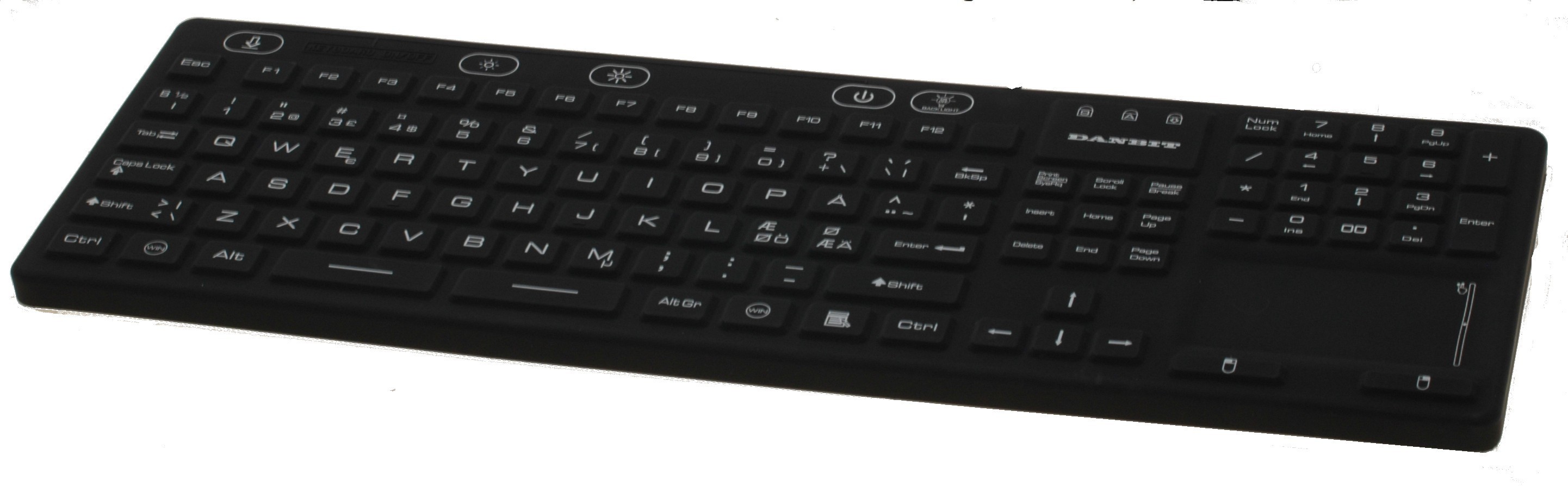 IP68 forseglet medico-tastatur med touchpad, USB, nordisk tegnsett, svart med bakgrunnsbelysning. PÅ/AV-knapp for rengjøring.