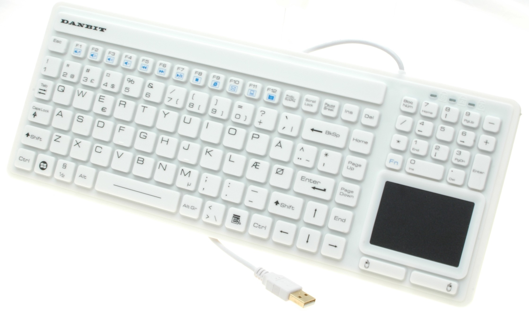 IP68 medico silikontastatur med pekeplate, USB, nordisk tegnsett, hvit