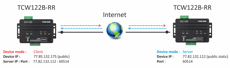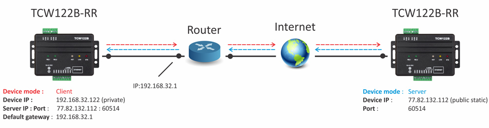 "Client" er forbundet til LAN, og "Server" er forbundet til forskellige LAN, men bag en router med offentlig IP-adresse og port forwarding.