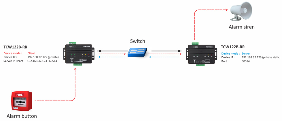 "Klienten" sender jævnligt status over sine digitale indgange til "Server". Som svar returnerer "Server" sin digitale indgangsstatus.