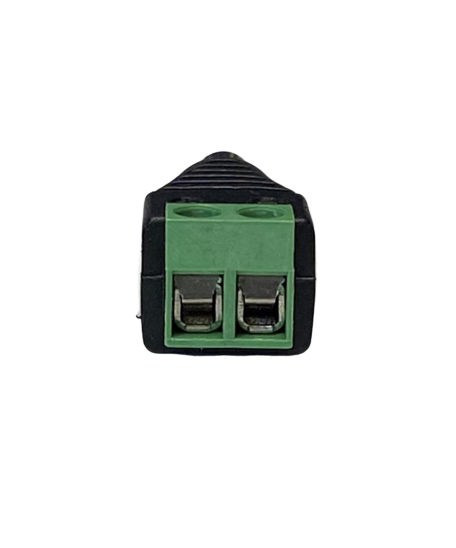 strømskontaktene (5,5/2,5 mm) med han terminalblokk som består av to skrueklemmer som indikerer pluss / minus-forbindelse