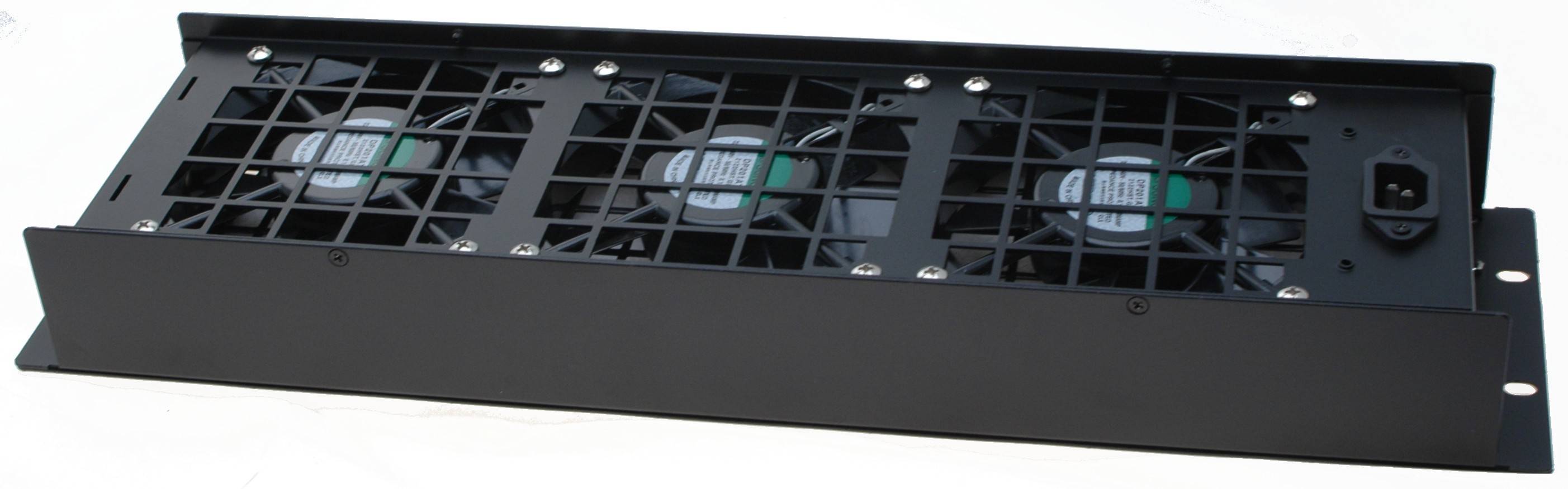 3U viftemodul for 19" stativ. Med 3 x 230VAC FAN. Modulen blåser luft inn i stativet. Utskiftbart frontinntaksfilter.