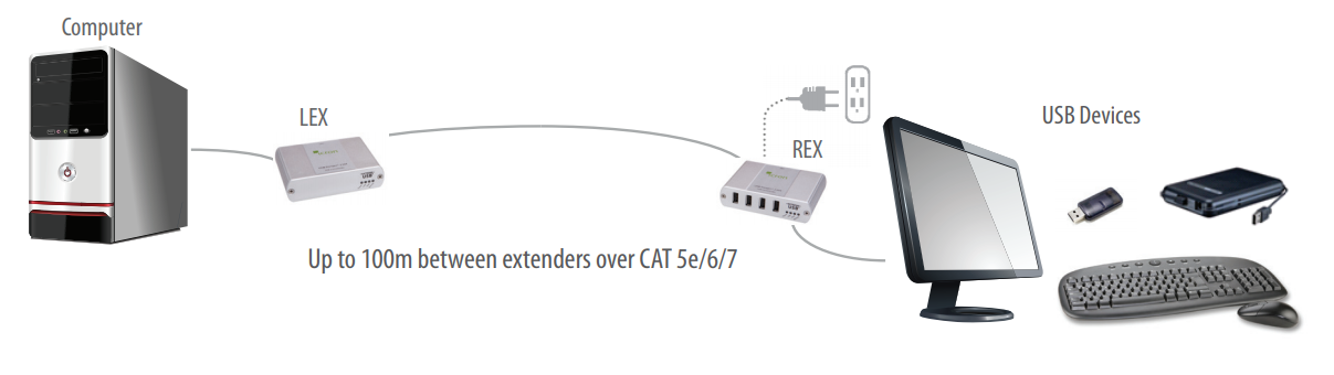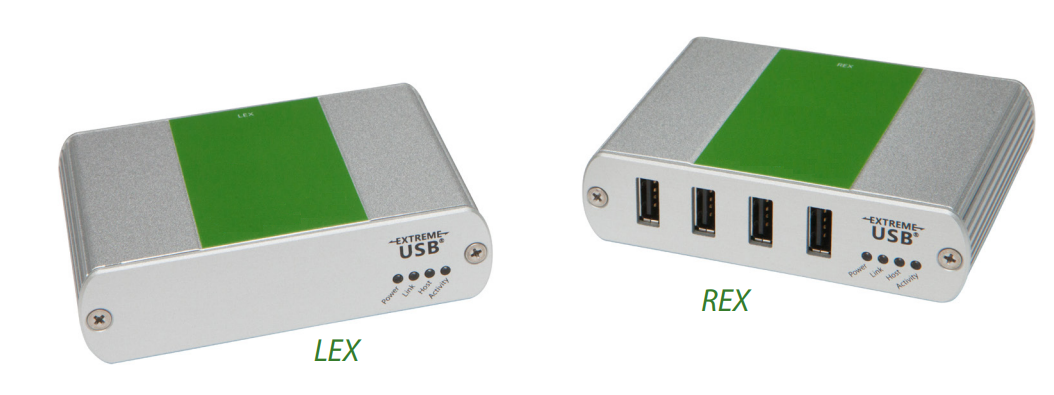 1 x RJ45 (LEX-enhet) til 4 x USB-A (REX-enhet)