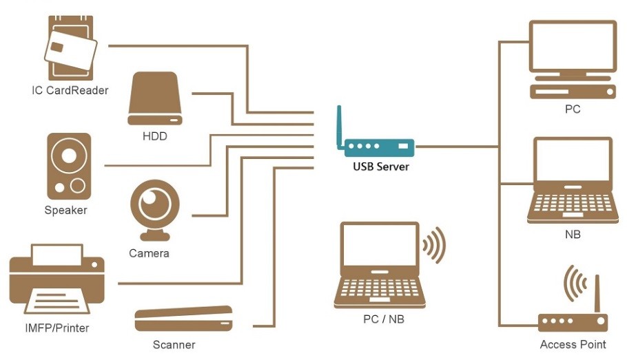 4-porters USB 2.0-server over Ethernet, 12 VDC, 10/100 Mbit/s LAN