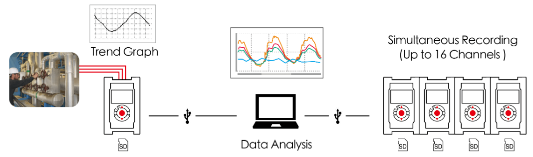 Dataloggeren er en 4-kanals batteridrevet logger. LOG-MCR4T er en temperaturlogger utstyrt med en termoelementsensor som kan måle fra -270 ℃ til 1760 ℃.