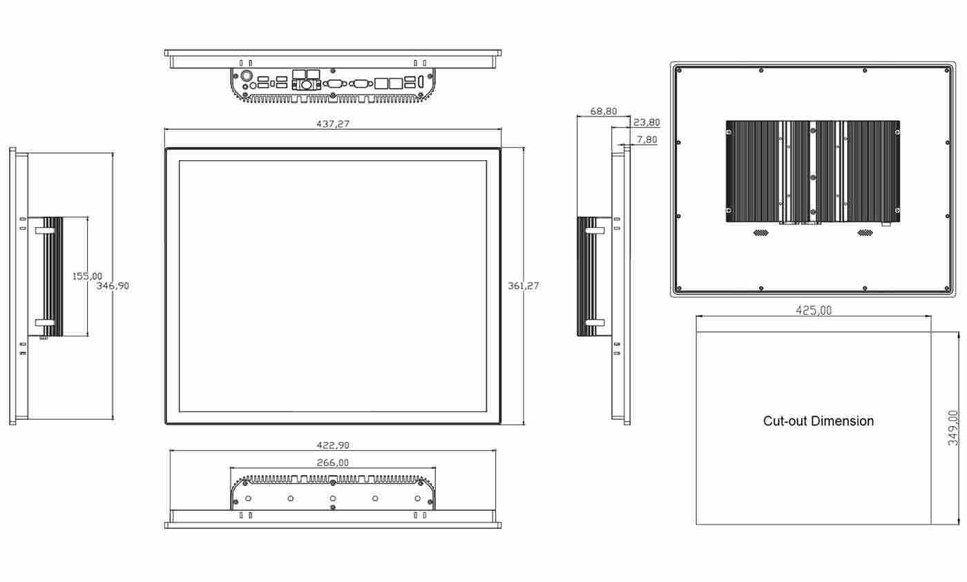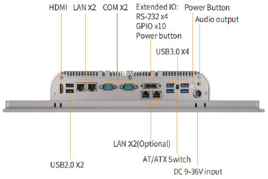 19" Panel PC IP65 foran, Celeron, I5 eller I7, 2xCOM, 2xRJ45, 9~36Vdc, 10Bit GPIO,