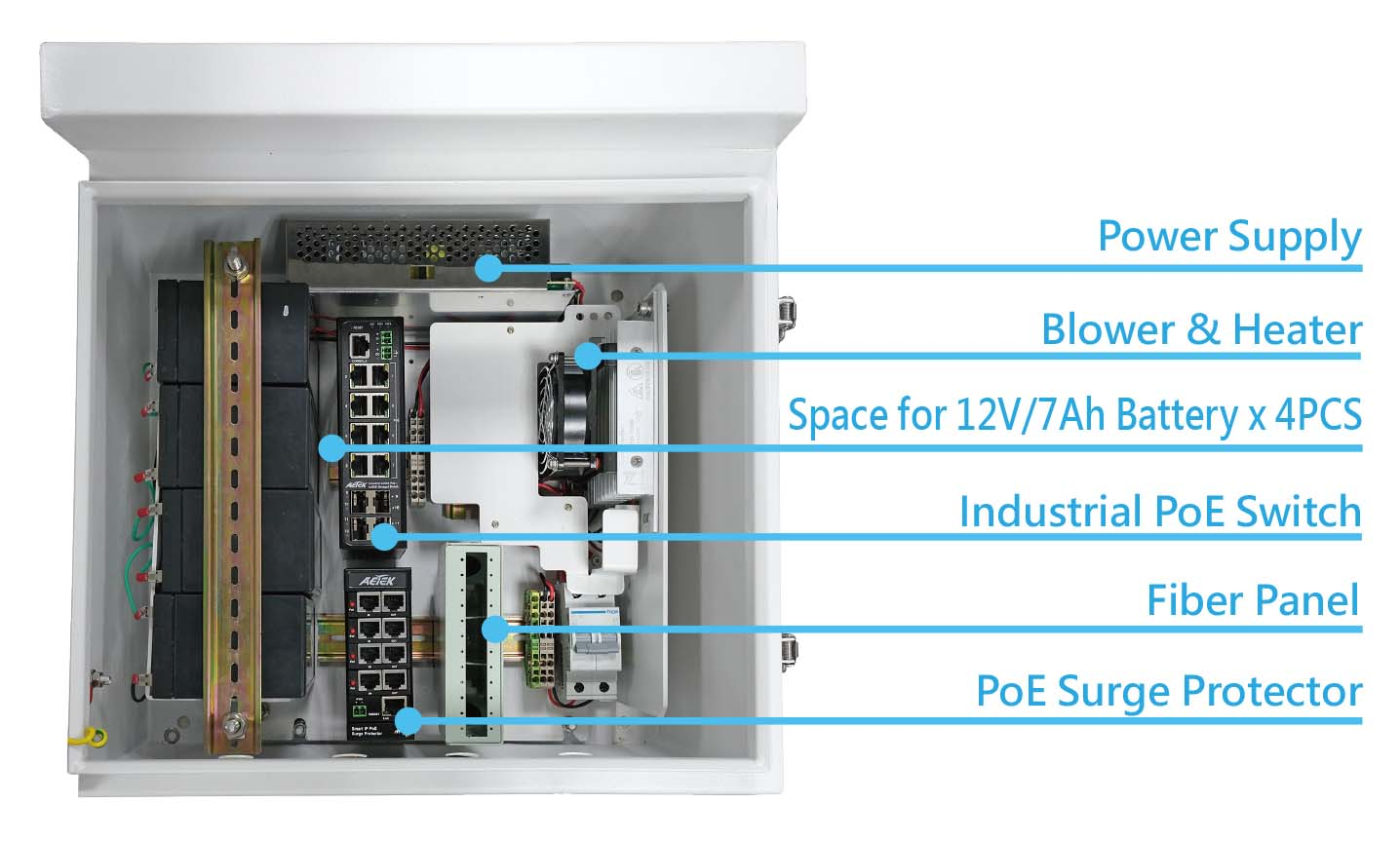 Kabinettet er produsert av rustfritt stål for styrke, holdbarhet og korrosjonsbestandighet. Den er ferdig med et slitesterkt hvitt pulverlakk som gir et attraktivt utseende. Med standard veggmontering og pol-monteringssett, er installasjonen for Kab-Poe-U rask og enkel.
