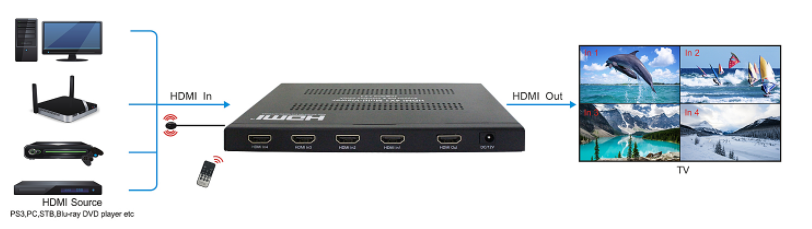 4K HDMI 4:1 QUAD Multi Viewer, 4 bilder på 1 skjerm, enkeltbilde, PIP etc. 4 x HDMI-inngang, 1 x HDMI-utgang, 4K30Hz