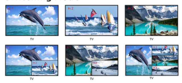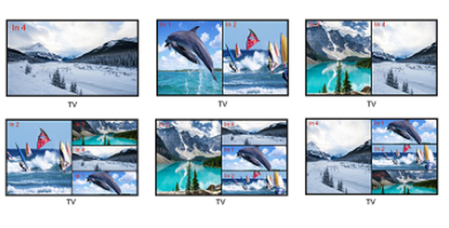 HDMI4X1MULTI gjør det mulig å vise 4 HDMI-kilder på 1 skjerm. Viser opptil 10 forskjellige bildekombinasjoner, eller bytt mellom hvert enkelt bilde. Du kan selv bestemme hvordan bildene skal ordnes
