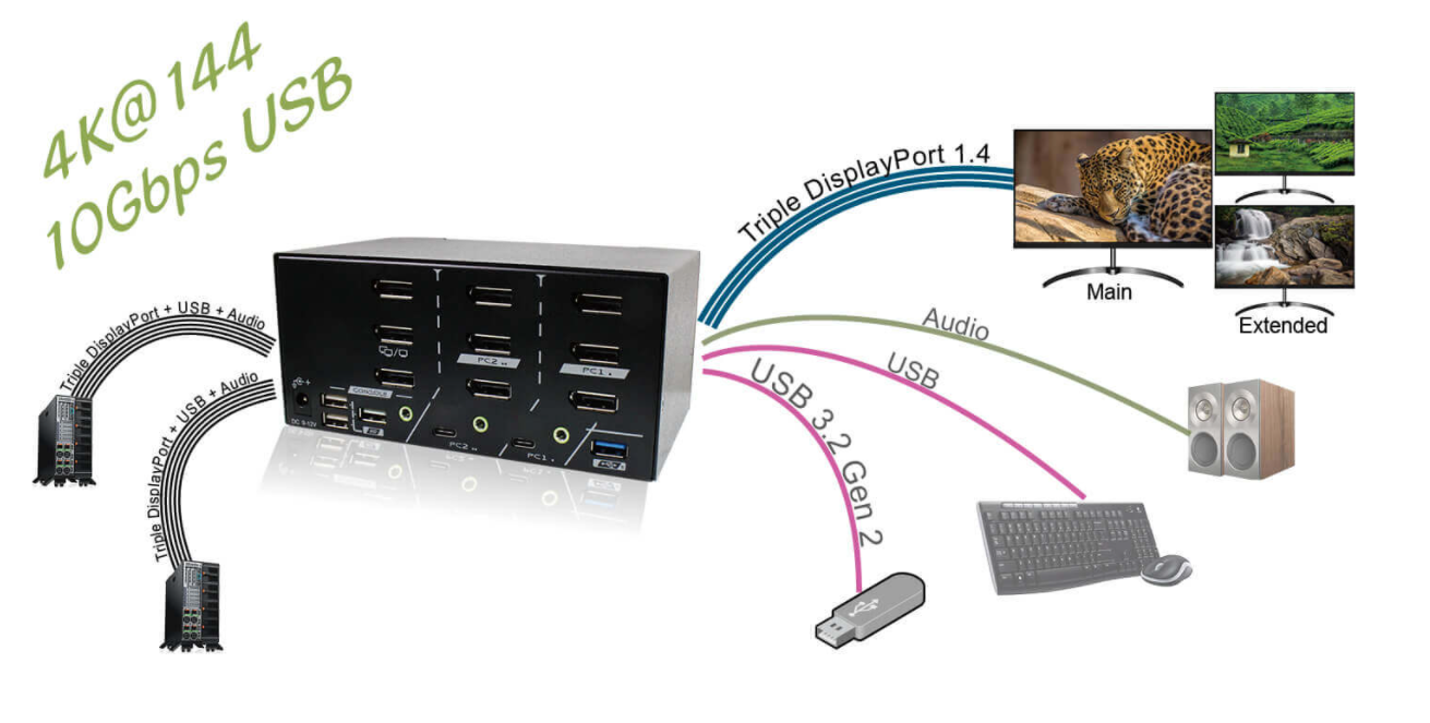 8K Triple Head (3 skjermer) KVM-svitsj støtter ikke bare vanlig PC, men også de nyeste PC-grafikkortene, som er ideell for innholdsskapere, grafiske designere, CAD- og CAM-designere og brukere i utdannings- og finansinstitusjoner for å arbeide effektivt. Denne DisplayPort 1.4 KVM-svitsjen støtter 8K 60Hz (4:2:0), 4K 144 Hz eller 5K, 60Hz oppløsning, kompatibel med HDCP-spesifikasjoner, auto EDID og støttede 16:9, 21:9 eller 32:9 skjermer. Det kan tilfredsstille enhver bruker å fullføre arbeidsprosjektene sine, nyte hjemmeunderholdning eller spille videospill med levende bilder, nøyaktige farger og skarpe detaljer.